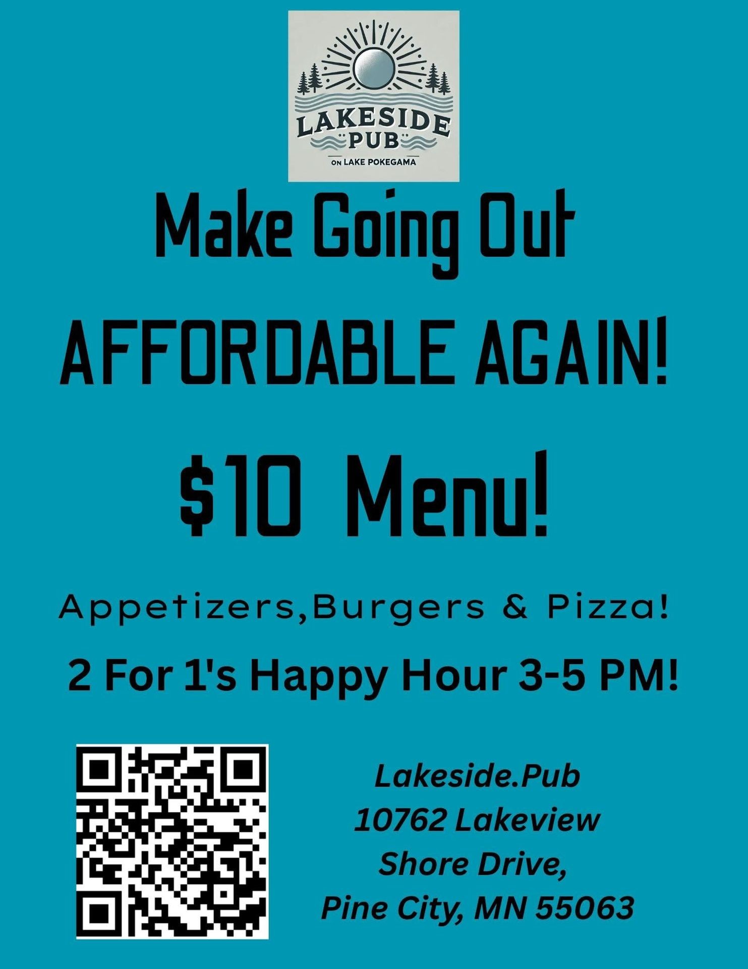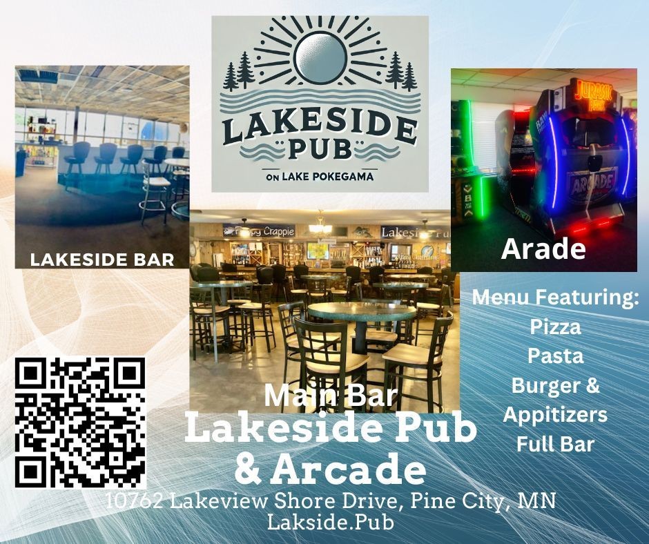 📍 10762 Lakeview Shore Dr, Pine City, MN 55063 On Lake Pokegama, Lakeside Pub & Arcade combines good food, drinks, and games in a relaxed setting. $8–$10 menu items Pull tabs & e-tabs Beer, wine, cocktails, live music Arcade, pool, darts Event Venue Hours Mon–Wed: Closed Thu: 3–10 PM Fri: 3 PM–1 AM Sat: 12 PM–1 AM Sun: 12–8 PM